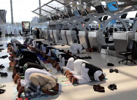 Des manifestants prient devant les entrées à l'aéroport. |