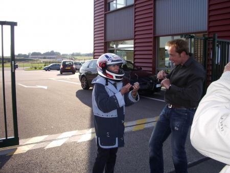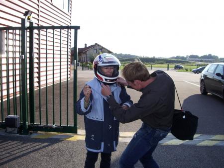 Mon jeune pilote à mes petits soins . Mon casque est-il bien en place ?