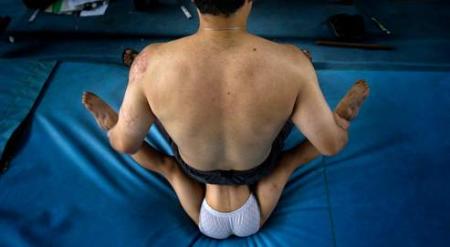 une très jeune fillette chinoise . Son coatch s'assied sur elle pour la rendre plus souple . Et là non plus je ne suis pas d'accord !
