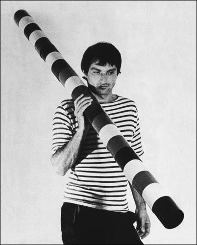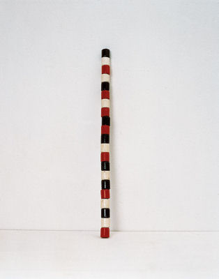 André Cadere d'origine roumaine ( 1934-1978 ) Le flâneur au bâton Ses bâtons sont composés de segments cylindriques , peints de couleurs différentes et assemblés selon un "système de permutation mathématique comportant toujours une erreur" |