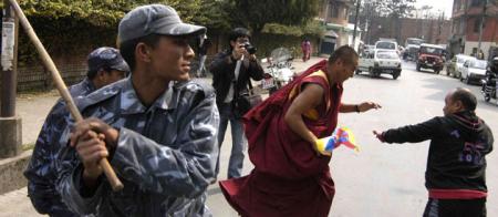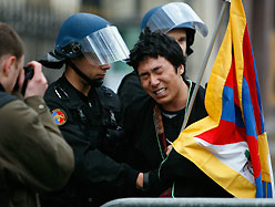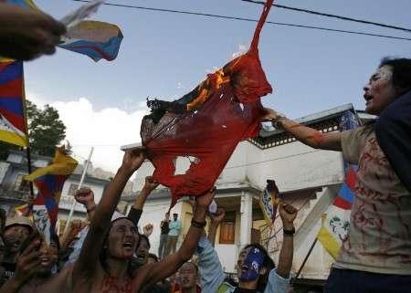 Des exilés tibétains brûlent le drapeau chinois . Des dizaines de morts , la plupart des moines tibétains et des étudiants . Où sont les droits de l'homme en Chine ? L'armée chinoise investit les provinces gagnées par les manifestations , des civils innocents sont tués , des policiers tibétains sont blessés par dizaines à Lhassa . |