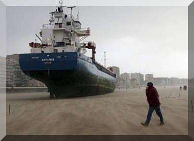 L'Artémis s'est échoué sur la plage des Sables d'Olonne avec la forte tempête d'avant hier , et il n'est pas prêt d'en repartir . Une tentative a été faite hier soir mais sans succès .