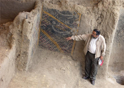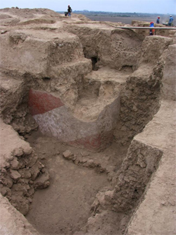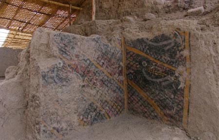 Au nord du Pérou , à 760 km de Lima , l'archéologue péruvien Walter Alva et son équipe , ont sorti de terre un ensemble de ruines au centre duquel se trouve un temple orné de peintures murales et comportant un escalier menant à un autel .