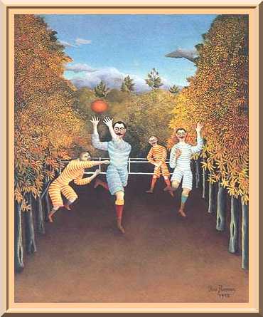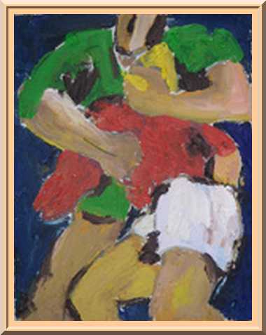 " Entre ciel et terre sur l'herbe rouge ou bleue , une tonne de muscles voltige en plein oubli de soi...Alors j'ai mis en chantier toute l'équipe de France , de Suède et cela commence à se mouvoir un temps soit peu , si je trouvais un local grand comme la rue Gauguet je mettrais deux cents petits tableaux en route pour que la couleur sonne comme sur les affiches sur la nationale au départ de Paris "