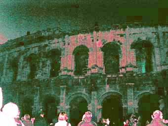 En fin de soirée , les nîmois ont eu droit à l'embrasement des arênes , spectacle son et lumière , avec des projecteurs qui lancaient des faisceaux multicolores sur les arênes mais aussi sur tous les batiments environnants . Cependant...le froid nous a fait partir avant la fin !