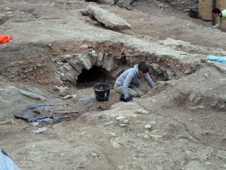 A gauche , cette jeune archéologue cherche des débris de mosaïque et en fait une reconstitution sur plaque de bois à droite