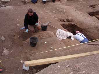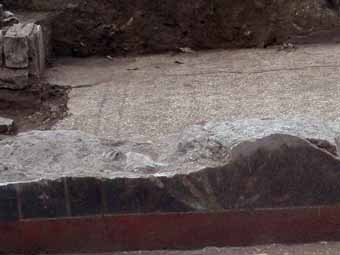 la voie Domitia très endommagée par la construction des abris anti-aériens , pendant la guerre . On voit d'ailleurs un morceau de béton qui faisait partie des fondations de ces abris , tout à fait en haut de la photo et à côté des planches de bois