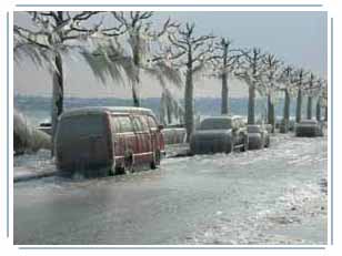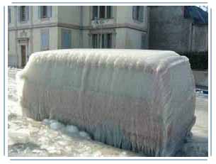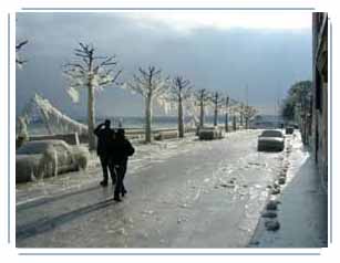Des températures négatives et des rafales très violentes de vent , ont provoqué ce qu'on appelle des pluies verglaçantes . L'eau du lac a été projetée sur les berges et a gelé immédiatement . Impressionnant , non ?