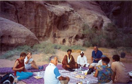 j'ai déjà parlé de notre voyage en Jordanie et si je continue , c'est parce que pour moi c'est un très bon souvenir , un très très bon souvenir . Nous avions passé plusieurs jours dans le désert des bédouins , en bivouaquant à la belle étoile , en parcourant au pas de course les grandes étendues de sable rouge , en mangeant à l'abri des gros rochers......Pourquoi "au pas de course " ? parce que nos guides étaient des gazelles et ne se rendaient pas compte que nous n'avions pas 20 ans comme eux . Bref , c'était pas grave et j'étais transportée de joie de me trouver dans de tels endroits .